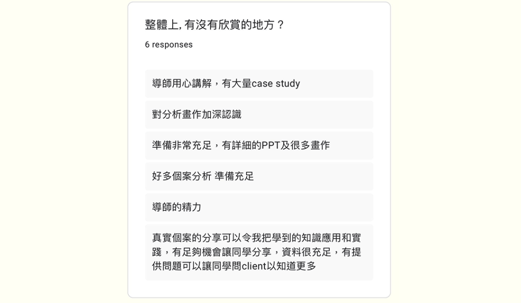 課程內容非常紮實,由基礎到跨學派理論,再到本地案例,每一環節都循序漸進。