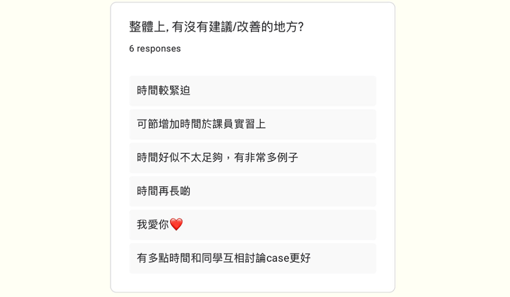 課堂設計理論與實踐並重。透過分組討論和即場分析,我能夠將所學的知識運用於真實情境,獲益良多。
