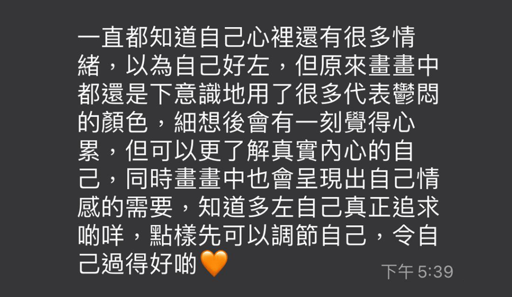 謝謝HKAPC帶我探索一個新領域,導師的專業及親和,打開了我對繪畫心理既認知和興趣,希望將來有機會再跟您學習多些,將學習到既用於工作及自我舒壓!